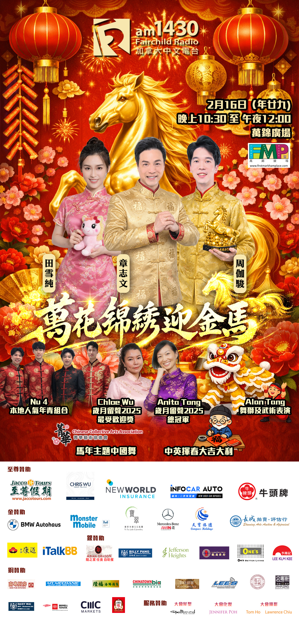 一年之計在於春,金馬奔騰報佳音!踏入 2026 年,最期待的農曆新年即將送到。2 月 16 日 (星期一) 年廿九大除夕夜 10:30pm,加拿大中文電台約定你《萬花錦繡迎金馬》,於萬錦廣場一齊倒數迎好年!